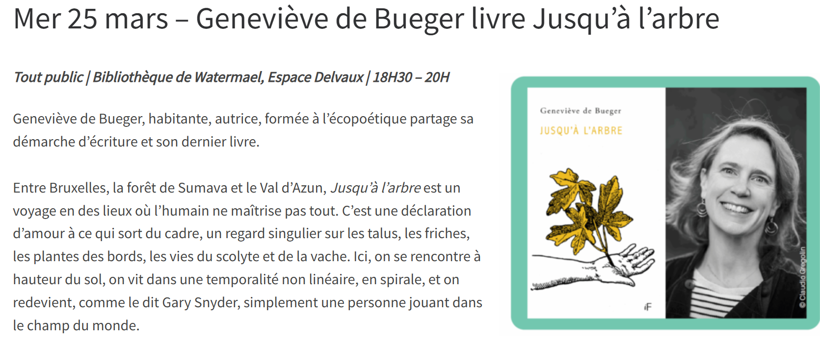 Une rencontre à la bibliothèque de Watermael-Boitsfort, la commune de Bruxelles où vit l’autrice Geneviève de Bueger, avec la modération de la Professeure de lettres à l’ULB Marie-Eve Damar.