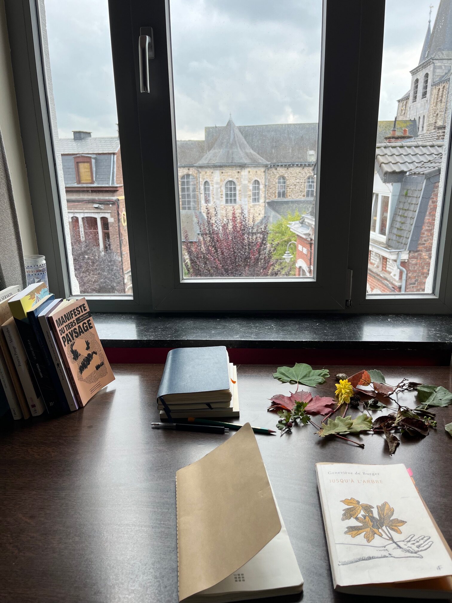 Quelques jours de résidence à la maison de la Poésie d’Amay, c’est un bureau calme, la vue sur sa collégiale ancrée, fidèle, une piste de Tiers paysages jusqu’à l’ancienne gravière, son lac monté des eaux mosanes, la crainte de ne pas trouver de friche où asseoir le public absoute par la vision d’un érable qui me fait découvrir un minuscule passage vers la friche idéale, magnifique, en totale liberté, où les herbes hautes ont appelé les graminées puis le cornouiller, l’aubépine, le frêne, où le guide-nature amoureux de la friche m’avertit ne vous inquiétez pas je suis aussi un policier – il pense bien que mon érable n’est pas un sycomore mais un plane – sa compagne écrit aussi, ils viendront samedi.